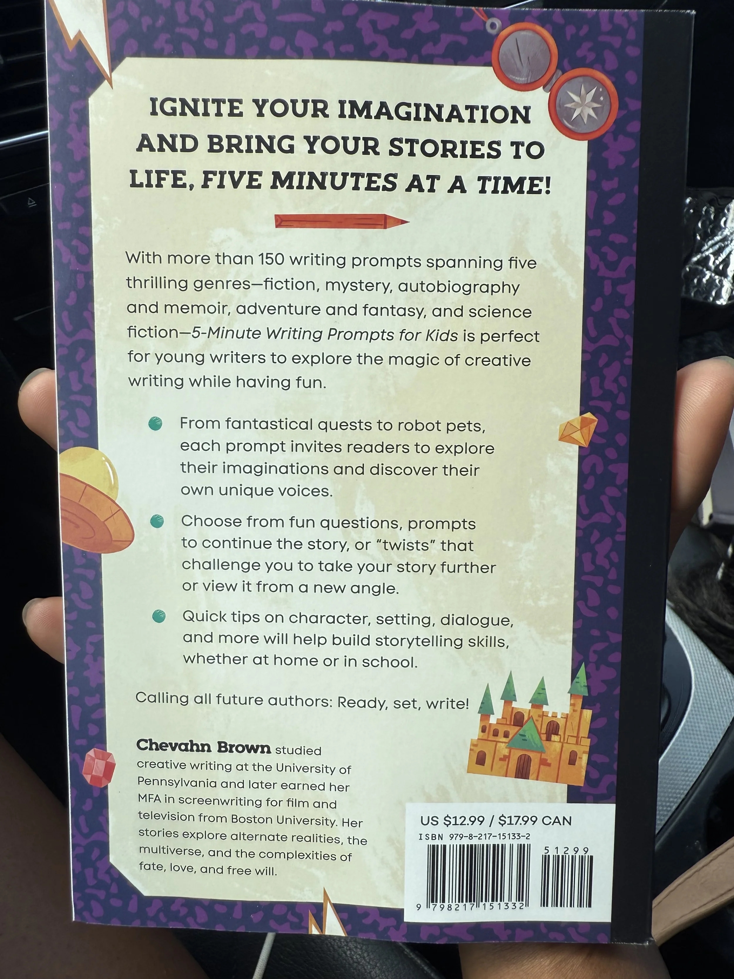 This book is so thoughtfully written and perfect for budding writers and also kids who could use more creative writing as an outlet for self-expression. Her prompts show her true understanding of how to nurture the creative mind especially in children without feeling heavy or trite. This will allow for writers to tap into original and fun, very unique in the prompts!